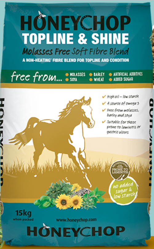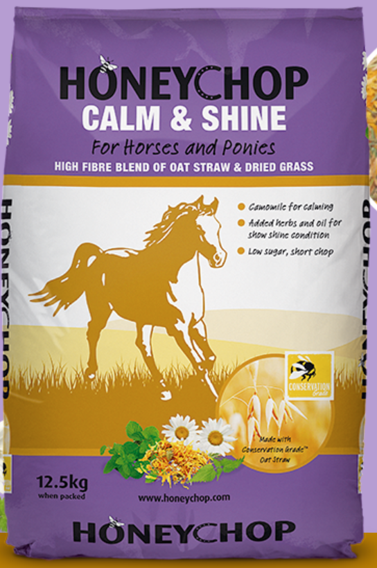 Honeychop Calm & Shine is a blend of high fibre oat straw, dried grass, marigold, nettle, mint, camomile and oil. Low in starch & sugar, it is an excellent fibre choice if your horse or pony is a little excitable or if you just want great condition and ease of riding.