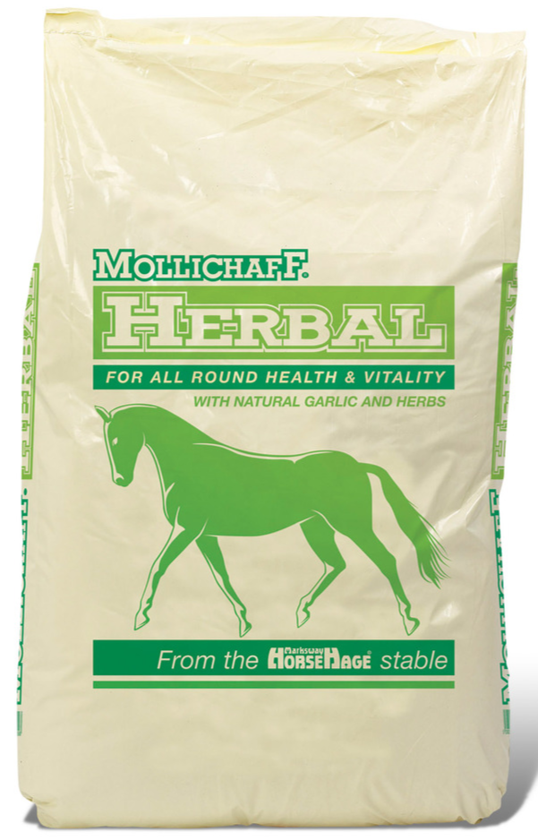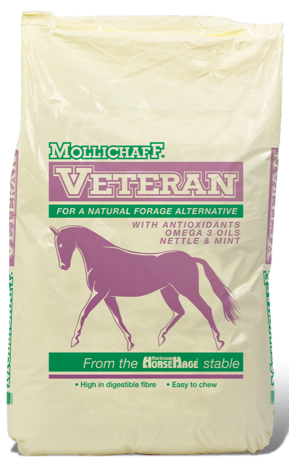 Mollichaff Veteran is a high fibre forage mix designed to complement the forage ration where necessary. It contains a balanced blend of dried grass, dried alfalfa and oat straw and is topped with a unique dressing combining linseed and soya oil with a very light dressing of molasses, plus added vitamins and minerals, plant-based antioxidants, mint, nettle, salt and added biotin. The high palatability of Mollichaff Veteran makes it ideal for horses and ponies that are unable to consume long forage and require a partial forage replacer.