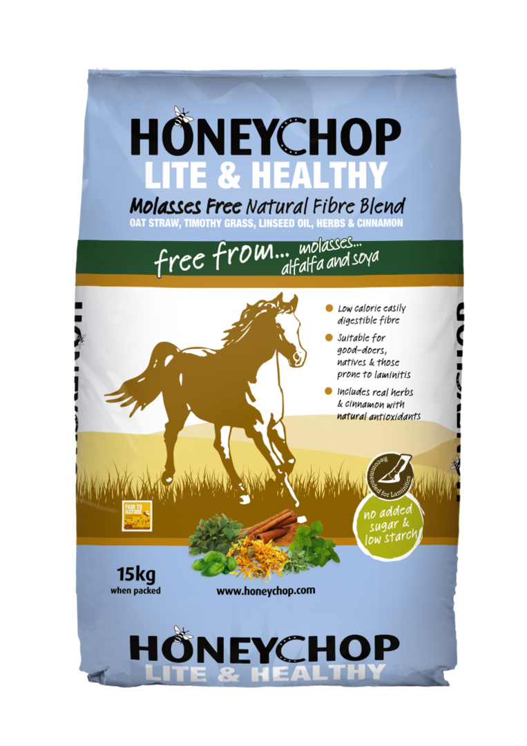 Honeychop Lite & Healthy, free from molasses, is a non-heating low sugar fibre feed coated with linseed & rapeseed oil, including oat straw, timothy grass, herbs, marigolds and cinnamon. The blend of natural fibres and selected herbs add natural variety to your horse, pony or donkey's diet, mimicking the natural environment in which they should graze.