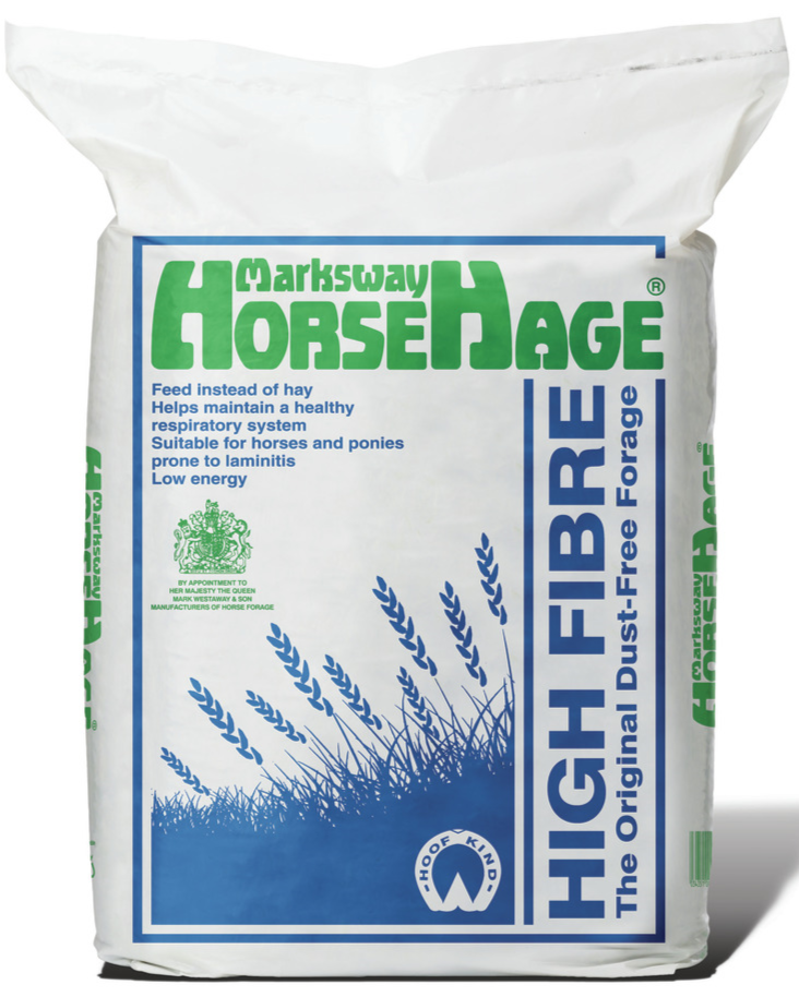 Marksway High Fibre HorseHage is made from a selected mix of grasses that are high in fibre and lower in protein and energy levels. Because High Fibre HorseHage is low in energy, it is generally suitable for all riding club and Pony Club horses, native ponies, veterans and those that are resting, convalescing or prone to laminitis. The HoofKind logo denotes its suitability for horses and ponies prone to laminitis.