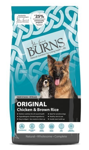 The original Burns recipe from 1993. Developed by Veterinary Surgeon; John Burns. Award-winning recipe. Natural and complete diet. Hypoallergenic. Highly digestible Suitable for sensitive dogs Composition: Brown Rice (67%), Chicken Meal (20%), Oats, Peas, Chicken Oil, Sunflower Oil, Seaweed, Minerals. Analytical Constituents: Crude Protein 18.5%, Crude Fat 7.5% 12kg bag